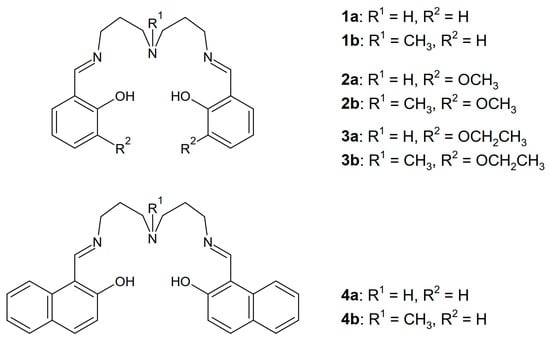 The suitable single crystals for single-crystal X-ray diffraction (SC-XRD) were obtained for compounds 1a, 2b, 3b, and 4b (Tables S1 and S2). Their crystal structures are composed of the [Fe(L5)(bylim)]+ cations and tetraphenylborate anions. In all the complexes, the pentadentate ligands wrap around the metal center with oxygen atoms in the trans position as is typical for the Fe(III) complexes with the L52− Schiff bases and heterocyclic co-ligands (Figure 1). The nitrogen atom of the bylim ligand is in the trans position to the secondary (1a) or tertiary (2b–4b) nitrogen atom. The crystal structures of the methylated complexes 2b–4b exhibit significantly longer metal–ligand (M-L) bond lengths than those in 1a and they are almost identical, as can be found in the previously published HS complexes of this group of compounds [16,20]. The longest M-L bonds were observed for bonds between the Fe(III) atom and tertiary amino nitrogen atom (2.22–2.29 Å), whereas the second longest bonds are those between the central atom and the nitrogen of the bylim ligand (Nbylim, 2.14–2.17 Å). The M-L bonds involving imino nitrogen atoms (Nim) and phenolic oxygen atoms are shorter (Fe-Nim = 2.04–2.09 Å, Fe-O = 1.91–1.95 Å).