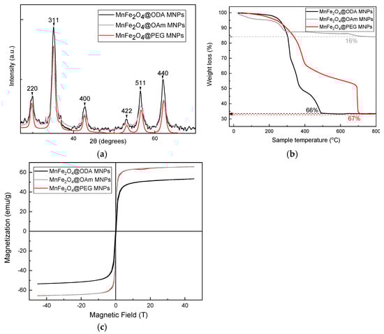 (a) XRD patterns, (b) TGA curves, and (c) VSM measurements of MnFe2O4@ODA, MnFe2O4@OAm, and MnFe2O4@PEG MNPs.