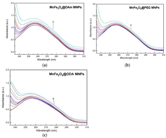 UV-vis absorption spectrum of CT-DNA (170 μM) alone at 260 nm and with increasing concentrations (0.6–17 μg/mL) of (a) MnFe2O4@OAm, (b) MnFe2O4@PEG, and (c) MnFe2O4@ODA MNPs.