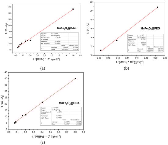 Plot of 1/(A-A0) versus 1/[MNPs] × 106 for (a) MnFe2O4@OAm, (b) MnFe2O4@PEG, and (c) MnFe2O4@ODA.
