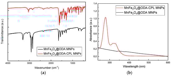 (a) FT-IR spectra and (b) UV-vis spectra of MnFe2O4@ODA and MnFe2O4@ODA-CPL MNPs.