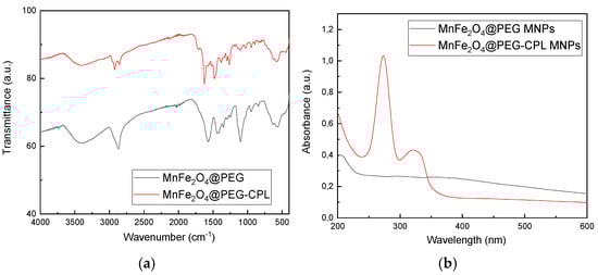 (a) FT-IR spectra and (b) UV-vis spectra of MnFe2O4@PEG and MnFe2O4@PEG-CPL MNPs.
