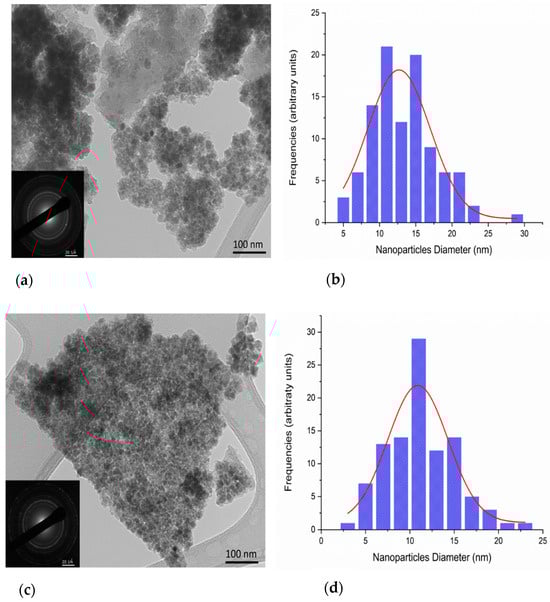 Bright-field TEM image of (a) MnFe2O4@PEG and (c) MnFe2O4@PEG-CPL MNPs with the size distributions at (b) and (d), respectively. In both TEM images, the corresponding diffraction pattern is depicted as an inset.