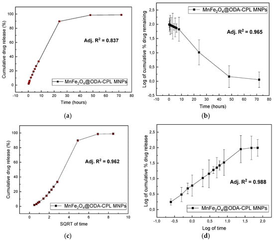 In vitro kinetics for analyzing the release mechanism of CPL from MnFe2O4@ODA-CPL via (a) zero-order, (b) first-order, (c) Higuchi, and (d) Korsmeyer–Peppas models.