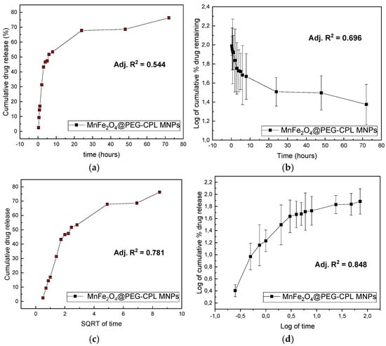 In vitro kinetics for analyzing the release mechanism of CPL from MnFe2O4@PEG-CPL via (a) zero-order, (b) first-order, (c) Higuchi, and (d) Korsmeyer–Peppas models.
