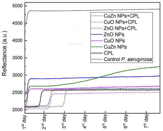P. aeruginosa growth curves using BacT/ALERT®3D in terms of reflectance, corresponding to the produced CO2 in the presence of the nano-oxides CuO, ZnO, and the bimetallic CuZn NPs, or in the co-administration of the NPs with CPL.