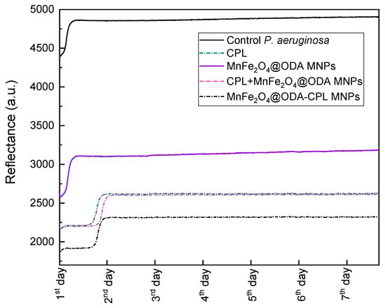 P. aeruginosa growth curves by the BacT/ALERT®3D in terms of reflectance corresponding to the produced CO2 in the presence of MnFe2O4@ODA MNPs, MnFe2O4@ODA-CPL MNPs, or in the co-administration of the MNPs with CPL.