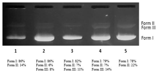 The bioefficiency of most antimicrobial agents is often related to their ability to interact with DNA. These agents may cause damage to the DNA’s structure, such as fragmentation, causing cell death by apoptosis []. In order to analyze further the mechanism of antibacterial activity, the ability of DNA cleavage by MnFe2O4@ODA MNPs, MnFe2O4@ODA-CPL MNPs, CPL, and the co-administration of MnFe2O4@ODA MNPs and CPL at concentrations of 0.5 mg/mL was also under investigation, and the results of the DNA cleavage study are given in Figure 11. DNA cleavage is regulated by the unwinding of the supercoiled plasmid DNA (Form I) to a nicked conformation (Form II) or/and a linear form (Form III). During the separation of circular plasmid DNA using electrophoresis, the supercoiled form moves the fastest []. Lane 5 shows untreated plasmid DNA with the supercoiled conformation observed with 78% intensity and the nicked conformation with 22% as a control lane. The progression of the cleavage reaction with MnFe2O4@ODA MNPs, a cocktail of MnFe2O4@ODA MNPs and CPL, MnFe2O4@ODA-CPL MNPs, and CPL is given in Lane 1–4. In particular, MnFe2O4@ODA MNPs appears not to cause nicks in the double helix of DNA and enhances Form I (Lane 1), while CPL does not affect Form I and causes ds nicks in the double-helix, creating Form III (Lane 4). Their co-administration, as expected, combines the characteristics of both actions, since it causes an amplification of Form I while at the same time creating Form III, but with a lower intensity (Lane 2). Finally, MnFe2O4@ODA MNPs functionalized with CPL exhibit drug-like activity (Lane 3), leading to the conclusion that these MNPs function as effective nanocarriers of the antibiotic drug CPL.