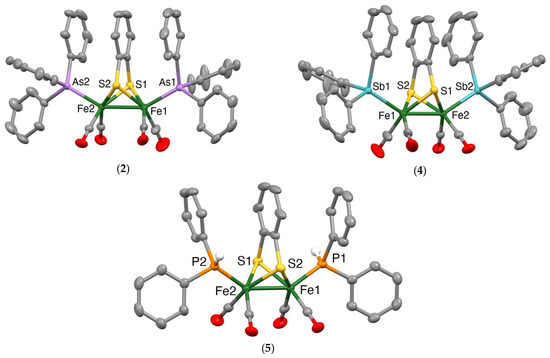 IR spectra in the carbonyl region are characteristic and informative with patterns and positions of bands being very similar to those for phosphine-substituted edt-and pdt-bridged complexes [33,42,46]. Mass spectra are also in good agreement with the proposed compositions, showing molecular ion peaks at m/z 698.20, 976.42, 745.04, 1070.10 and 736.31 for 1–5, respectively, in addition to peaks corresponding to the sequential loss of all COs. 1H NMR spectra are not very informative but show resonances attributed to EPh3 (E = As, Sb) and C6H4 ligands in the region 7.42–5.61 ppm. The molecular structures of 1–5 were determined by X-ray diffraction analysis of single crystals that were obtained by slow diffusion of n-hexane into CH2Cl2 solutions.