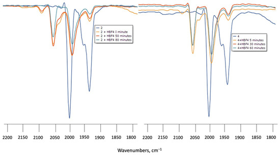 (left) FTIR spectra of 2 in CH2Cl2 turquoise (complex 2), orange (complex 2 + HBF4 after 1 min), red (complex 2 + HBF4 after 50 min) and green (complex 2 + HBF4 after 80 min) (right) FTIR of 4 in CH2Cl2 turquoise (complex 4), orange (complex 4 + HBF4 after 1 min), red (complex 4 + HBF4 after 30 min) and (complex 4 + HBF4 after 60 min).