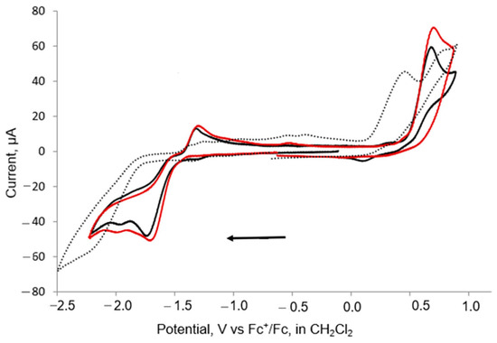 CVs of 1 (black), 3 (red) and 2 (dots) in CH2Cl2 at 0.1 V/s scan rate (1 mM solution, supporting electrolyte [NBu4] [PF6], glassy carbon electrode, potential vs. Fc+/Fc; initial negative sweep—see arrow).