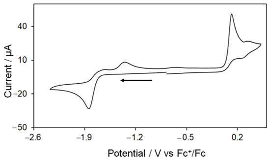 Cyclic voltammogram of [Fe2(CO)4(PPh2H)2(μ-bdt)] (5) in MeCN (1 mM solution, supporting electrolyte [NBu4] [PF6], glassy carbon electrode, potential vs. Fc+/Fc scan rate = 0.1 V/s; initial negative sweep—see arrow).
