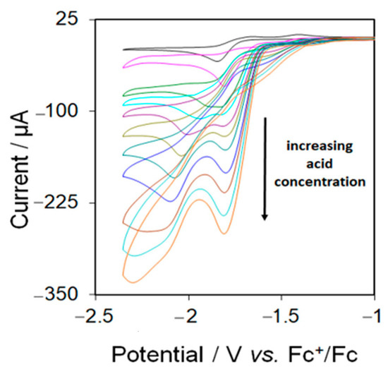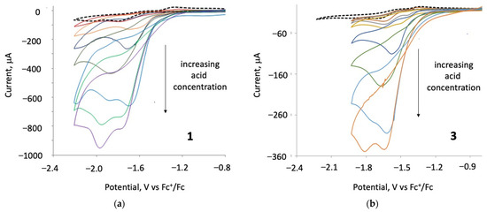 Catalytic studies were carried out on 1–3 in the presence of para-toluene sulfonic acid (p-TsOH) and, in each case, a catalytic response was observed. The protonation experiment of 1–4 in the presence of 2–3 equivalents of p-TsOH or HBF4.Et2O in CH2Cl2 did not show any evidence of protonation (Figures S1 and S4). After the addition of three equivalents of p-TsOH to 1 and 3, a new catalytic reduction peak appeared at ca. −1.6 V for 1 and at ca. −1.4 V for 3 (Figure 7). Upon increasing acid concentration, these new first reduction peaks show catalytic behaviour—they increase and are shifted to more negative potentials, merging with the second reduction waves for each of the two complexes [39], a feature which may correspond to chemically irreversible reductions of 1 and 3. Upon the addition of 18 equivalents of acid, new catalytic peaks occur at ca. −1.9 and −1.8 V for 1 and 3, respectively. The height of the reduction wave increases with the addition of successive molar equivalents of p-TsOH, indicating that 1 and 3 catalyse proton reduction at both their first and second reduction potentials. In the presence of 3–18 equivalents of p-TsOH, complex 2 showed two new (non-catalytic) reduction waves at ca. −1.2 and −1.5 V vs. Fc+/Fc and a catalytic wave at −2.2 V (Figures S9 and S12).