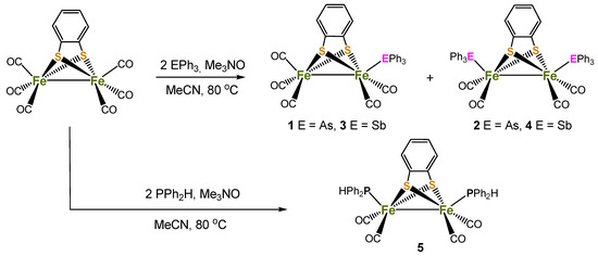Reaction of [Fe2(CO)6(µ-bdt)] with two equivalents of AsPh3 or SbPh3 in the presence of Me3NO.H2O in MeCN at 80 °C afforded the mono-substituted complexes, [Fe2(CO)5(µ-bdt)(EPh3)] (1, E = As, 39%; 3, E = Sb, 42%) as the major products, together with smaller amounts of disubstituted products [Fe2(CO)4(µ-bdt)(EPh3)2] (2, E = As, 17%; 4, E = Sb, 22%) (Scheme 1). Monosubstituted complexes alone were isolated from room temperature reactions in CH2Cl2. In contrast, a similar reaction between [Fe2(CO)6(µ-bdt)] and Ph2PH led to the isolation of only disubstituted [Fe2(CO)4(PPh2H)2(μ-bdt)] (5) in moderate yield (51%). The PPh2H analogue of 1 and 2, i.e., [Fe2(CO)5(PPh2H)(μ-bdt)], and 5 were previously synthesised by Kaur-Ghumaan and co-workers from a room temperature reaction between [Fe2(CO)6(µ-bdt)] and PPh2H in toluene [33]. These authors also noted that when the reaction was carried out under refluxing conditions it afforded mainly 5, which is consistent with the isolation of only 5 in our case. Since [Fe2(CO)5(PPh2H)(μ-bdt)] was structurally characterised and its electrochemical and electrocatalytic properties were also investigated properly [33], we deliberately chose the method which affords only 5 in order to maximise its yield. Complexes 1–5 are air-stable in the solid state and soluble in polar organic solvents, but insoluble or sparingly soluble in non-polar organic solvents. They have been characterised by IR and 1H NMR spectroscopy, elemental analysis, mass spectrometry, electrochemical studies, and single-crystal X-ray diffraction analyses. Full details of the synthetic procedures and spectroscopic data can be found in the experimental section.