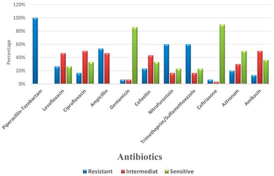 It emerged that 40 out of 64 isolates (62.5%) were MDR strains, following a period of incubation of 24 h at 37 °C. All of the tested isolates exhibited resistance to piperacillin–tazobactam, 6 isolates (15%) were found to be resistant to levofloxacin, and 6 isolates (15%) exhibited resistance to ciprofloxacin. Fifteen isolates (37.5%) did not exhibit growth inhibition by ampicillin, two strains (5%) and six isolates (15%) did not exhibit growth inhibition by cefoxitin, and 17 isolates (42.5%) did not exhibit growth inhibition by nitrofurantoin (Figure 2).