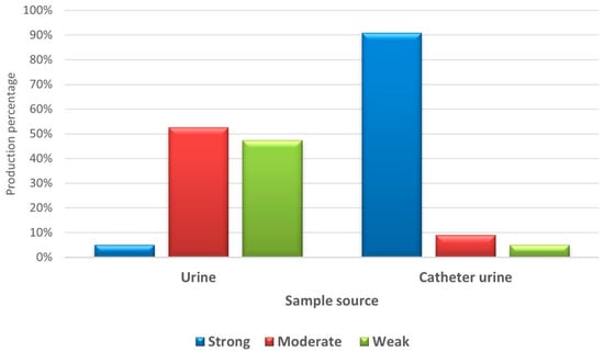 Percentage of biofilm per microtiter plate for P. mirabilisisolates according to urine source.