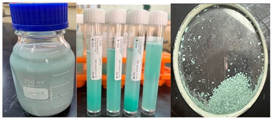 P. mirabilis isolates were used to biosynthesize the nanocomposite. Besides generating light blue precipitates, the color changed to blue from yellow, indicating the development of nanoparticles. The precipitate had a greenish–blue appearance upon centrifugation. Following microwave drying, a gleaming blue powder was produced (Figure 4).