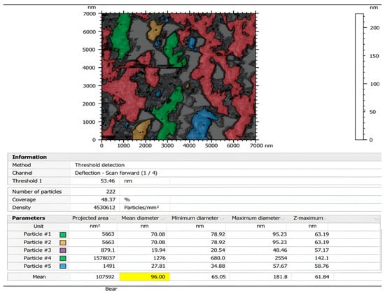 The CuO-ZnO NPs were subjected to AFM analysis using CSPM in order to detect and describe the nanoparticle distributions. The mean square roughness and estimated particle size were calculated. The average grain size of the nanoparticles was 96.00 nm, as can be seen in the three-dimensional profile of the nanocomposite in Figure 6. To gain a better understanding of the topography and roughness of the 1.93 μm, 3.3 μm, and 3.46 μm nanoparticles, several magnification ranges were used.