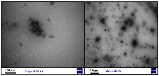 The size and shape of the nanocomposites were investigated using TEM imaging. TEM assessment supports analysis of the nanoparticles’ core structure. The TEM images (Figure 7) show agglomeration, with the formation of particles with spherical and semi-spherical geometries. The TEM images demonstrate the spherical shape of CuO-ZnO NPs, which are created by oxidizing copper and zinc ions by utilizing the P. mirabilis filtrate.