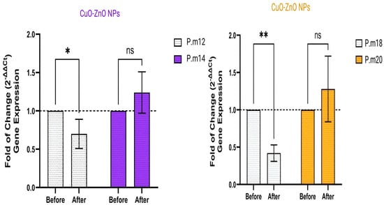 To evaluate the effects of CuO-ZnO nanocomposites on associated gene expression, RT-PCR was used. The downregulation effect was observed in four isolates (P.m12, P.m14, P.m18, and P.m20) as 0.659, 1.693, 0.37, and 1.20, respectively, while one isolate (P.m25) did not exhibit any interaction with nanocomposite stress with the folding of 1.693, as shown in Table 5. The remaining two isolates (P.m12 and P.m18) experienced a down-regulating effect with a fold change of 0.659 and 0.37 under CuO-ZnO NP stress.