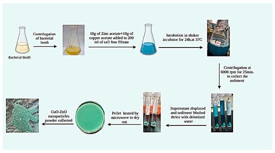 For nanoparticle synthesis, the precipitation method was used. A 200-milliliter filtrate of P. mirabilis broth was mixed with 10 g of zinc acetate and 10 g of copper (II) acetate, with the temperature maintained at 37 °C. The mixture was sealed in a dark plastic bag and incubated in a shaker for 24 h. Following incubation, the mixture was centrifuged, and the precipitate was collected. A three-step washing process using deionized water was performed to remove any residual impurities. The formation of CuO-ZnO nanoparticles was visually confirmed by a color change in the reaction mixture, indicating successful nanoparticle synthesis. The obtained precipitate was air-dried and stored under dry conditions for further characterization and evaluation [13] (Figure 12).