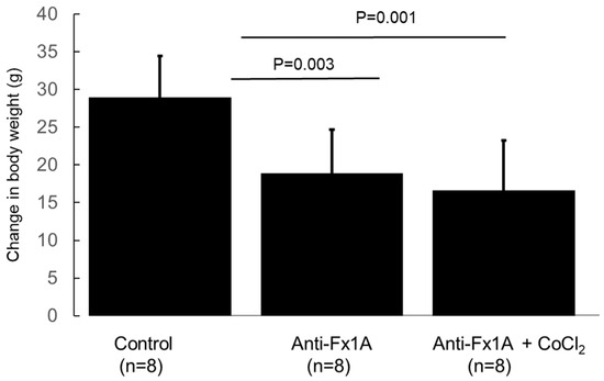 Treatment with CoPPIX, PPIX, and CoCl2 did not have an apparent effect on locomotor activity or cause an anxiety-like behavior. By day 14 (study endpoint), there was a statistically significant weight loss in rats injected with anti-Fx1A antibody (Ab) (Figure 1) compared to the controls. There was no further loss in body weight in rats injected with this Ab and treated with CoCl2.
