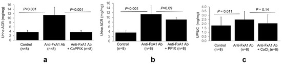 Effect of CoPPIX, PPIX, and CoCl2 treatment on proteinuria. Urine protein excretion, expressed as urine albumin to creatine ratio (ACR, mg/mg) or as total urine protein Up to urine creatinine (Uc) ratio (Up/Uc) in cobalt protoporphyrin IX (CoPPIX), protoporphyrin IX (PPIX), and cobaltous chloride (CoCl2)-treated rats with anti-FX1A immune serum-mediated podocyte injury. (a) CoPPIX treatment reduced ARC to a level that was no different from the control. (b,c) PPIX or CoCl2 treatment did not significantly reduce proteinuria.