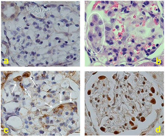 Histologically, there were glomerular lesions consistent with previously characterized glomerular pathology in this model [13,14]. Specifically, compared to the glomeruli of the control rats (Figure 3a), in the glomeruli of rats with anti-FX1A immune serum-induced podocyte injury, podocyte nuclei were enlarged (Figure 3b, encircled segment), and there was segmental hypercellularity with a mild increase mesangial matrix. In CoPPIX-treated rats, HO-1 was induced and immunolocalized in a minority of podocytes, as shown in a typical glomerular section (Figure 3c, arrowed cells) when compared to the number of podocytes identified as cells positive for the WT1 marker (cells with dark brown nuclei in Figure 3d).