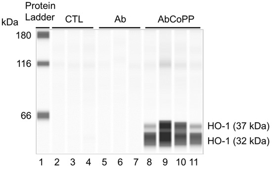 HO-1 protein levels determined using Western blot analysis of kidney cortex total protein lysates from control rats (CTL group, capillaries 2, 3, 4), from rats with anti-Fx1A antibody-mediated podocyte injury (Ab group, capillaries 5, 6, 7) and from CoPPIX-treated rats with podocyte injury (AbCoPP group, capillaries 8, 9, 10, 11). Total protein loaded for analysis was 16–20 pg.