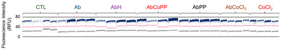 Absolute quantification of changes in HMOX1 gene expression (mRNA transcripts) in renal cortical tissue samples of rats with anti-Fx1A Ab mediated podocyte injury treated with CoPPIX, FePPIX, PPIX, and CoCl2 was assessed using digital PCR (dPCR) performed as described in Section 4. A representative 1D dPCR scatterplot for the HMOX1 gene is shown in Figure 5.