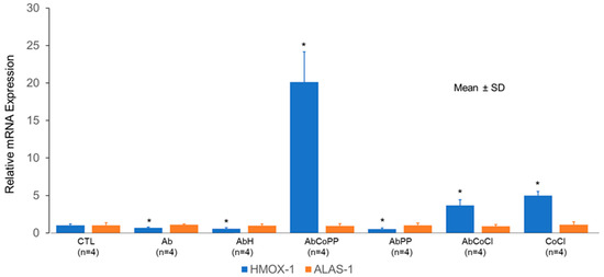 Changes in the relative expression of HMOX1 and ALAS1 mRNA transcript levels in rat kidney cortical tissues. Levels were expressed relative to those in the control group (taken as 1) as described in Section 4, and values are presented as means and standard deviations. Analysis of Variance (ANOVA) with post hoc pairwise comparisons using the Tukey–Kramer test was used to determine mean differences in mRNA levels across groups. CTL, Control group. Ab, rats injected with anti-Fx1A immune serum (Ab) only. AbH group, rats injected with anti-Fx1A immune serum and treated with Fe-protoporphyrin IX (FePPIX), also known as hemin (H). AbCoPP group, rats injected with anti-Fx1A immune serum and who received cobalt protoporphyrin IX (CoPPIX) treatment. AbPP group, rats injected with anti-Fx1A immune serum and who received metal-free protoporphyrin IX (PPIX) treatment. AbCoCl group, rats injected with anti-Fx1A immune serum and treated with cobaltous chloride. CoCl group, normal rats treated with cobaltous chloride only. *, indicates a significant increase or decrease compared to the control.