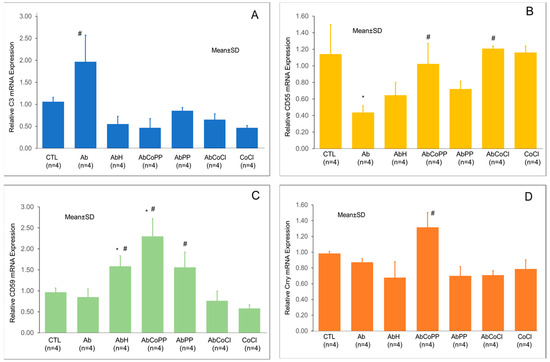 Effect of treatment of rats with podocyte immune injury on expression levels (mRNA) of C3, CD55, CD59, and Crry in whole cortex assessed using dPCR. Values are expressed as means and standard deviations. Analysis of Variance (ANOVA) was used to determine mean differences in mRNA levels across groups. Post hoc pairwise comparisons were performed using Tukey–Kramer’s tests. Panel (A): In rats with immune injury (Ab group), cortical C3 mRNA levels increased compared to controls (CTL group). This effect was reversed in all treatment groups (AbH, AbCoPP, AbCoCl). #, indicates a significant difference between the Ab group and all other groups. Panel (B): In rats with immune injury (Ab group), CD55 mRNA was significantly reduced compared to the CTL group (indicated by *). FePPIX treatment (AbH group) partially but not significantly reversed CD55 mRNA reduction, and levels remained significantly lower compared to controls (CTL). Both CoPPIX and CoCl2 treatments (AbCoPP, AbCoCl groups) significantly reversed CD55 reduction compared to the Ab group (indicated by #) to levels that were no different from the controls. PPIX treatment (AbPP group) had no significant effect. Panel (C): Immune injury (Ab group) had no effect on CD59 mRNA levels compared to controls. Treatment of rats with immune injury with FePPIX (AbH group), CoPPIX (AbCoPP group), or PPIX (AbPP group) significantly increased CD59 mRNA (indicated by #) compared to untreated animals (Ab group) and to the control group (indicated by *). CoCl2 treatment (AbCoCl group) had no effect. Panel (D): Immune injury (Ab group) had no effect on cortical Crry mRNA levels compared to controls (CTL group). Crry mRNA in rats with immune injury increased significantly (indicated by #) only in response to CoPPIX treatment (AbCoPP group).