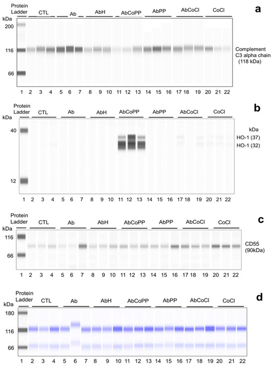 The results are shown in Figure 8, which demonstrates protein levels in tissue lysates analyzed using capillary electrophoresis-based Western blot analysis. C3 protein was present in lysates from control animals (panel a, CTL group, capillaries 2, 3, and 4), and levels increased in lysates from rats with immune injury (panel a, Ab group, capillaries 5, 6, and 7). In tissue lysates from FePPIX (hemin, H) and CoPPIX-treated animals (panel a, groups AbH and AbCoPP, capillaries 8–13), C3 protein decreased compared to the non-treated rats with injury (Ab group). CoCl2 treatment (panel a, AbCoCl group, capillaries 17, 18, 19) also decreased C3 protein, albeit to a lesser degree compared to FePPIX and CoPPIX treatments. PPIX treatment (panel a, AbPP group, capillaries 14, 15, 16) had no effect. Only CoPPIX treatment caused a robust HO-1 induction (Figure 8, panel b, capillaries 11, 12, 13). FePPIX treatment had no effect on HO-1 (panel b, capillaries 8, 9, 10), while CoCl2 treatment had a weak effect (panel b, capillaries 17, 18, 19) that was comparable to that of CoCl2 administration to normal rats (panel b, capillaries 20, 21, 22). The decrease in C3 protein in FePPIX or CoPPIX-treated rats with immune injury (Figure 8, panel a, lanes 8–13) was not associated with a significant change in CD55 protein levels (Figure 8, panel c, capillaries 8–13). CoCl2 treatment of normal rats (no immune injury) significantly increased CD55 protein (Figure 8, panel c, capillaries 20, 21, 22).