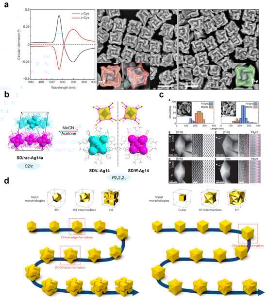Since the synthesis of most chiral inorganic nanomaterials involves the use of chiral ligands, early studies generally assumed that chiral organic molecules play a key role in their formation. However, the existence of chiral metal nanoclusters (Figure 4b) without the utilization of chiral ligands has challenged this traditional view [42,78,82]. In 2021, Prof. Paul Alivisatos [79] investigated the growth of chiral crystals using electron microscopy. The research revealed that the kinetics of the intrinsic growth reaction of crystals is the primary factor contributing to the generation of chiral structures. Moreover, it was demonstrated that chiral molecules are incapable of inducing the formation of chiral Te crystals (Figure 4c). These findings were published in Science. In 2024, the team of Young Min Kim and Ki Tae Nam [80] from Seoul National University revealed two ways for Au nanoparticles to change from achiral to chiral morphology (Figure 4d): rhombic dodecahedron (RDH3) and cubic (CBH1) models by generative cellular automata (GCA) combined with deep learning. It was shown that chirality is initially determined by the asymmetric growth of the boundaries of enantiomorphic high-index crystal planes and that the symmetry of the crystal species is inherited and has evolved to eventually form a helical morphology. For example, the asymmetric expansion of the {110} crystal seed in the RDH3 model leads to a 432 helix III morphology, whereas the cubic seed in the CBH1 model forms a helix I morphology by prismatic twisting. This suggests that the formation of chiral Au nanoparticles is closely related to symmetry breaking during crystal growth, providing a theoretical model for the origin of crystallographic chirality.