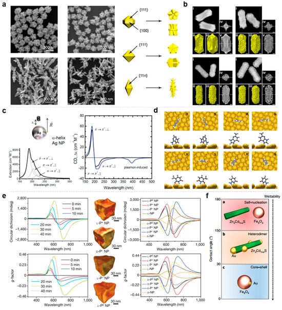(a) Chiral nanoparticles and schematics of their synthesis [98]. Reproduced with permission. Copyright 2023, ACS. (b) Morphological characterization of Au NPs obtained by increasing the concentration of (R)−LipoCYS during chiral overgrowth [89]. Reproduced with permission. Copyright 2023, ACS. (c) A model of an interacting Ag NP and R−helix and theoretical fit to the extinction of the R−helix [102]. Reproduced with permission. Copyright 2010, ACS. (d) Binding orientation of nucleobases on Au (321)R/S surfaces [88]. Reproduced with permission. Copyright 2022, Nature Communications. (e) Morphology and spectroscopy of photosynthesized chiral nanoparticles (NPs) [103]. Reproduced with permission. Copyright 2022, Nature. (f) Regioselective magnetization of one−dimensional nanorods [104]. Reproduced with permission. Copyright 2020, Nature Nanotechnology.