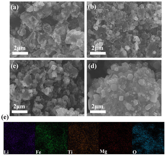 SEM was employed to explore the microscopic morphology of the LiFT-Mgx samples. There were no significant changes in the structure (Figure 1a–d). They exhibited a clear calcined body structure, and this was formed by the aggregation of numerous tiny and irregular particles with obvious agglomeration phenomena, and the size of the particles forming the agglomerates ranged from 200 nm to 500 nm. It was declared that Mg doping had little effect on the microscopic morphology of the materials. This phenomenon might be due to the fact that the dopant ions were able to effectively occupy the lattice positions without destroying the symmetry and integrity of the original crystals [12]. Therefore, even if the doped samples showed morphological changes, such as the appearance of new agglomerates or a slight increase or decrease in grain size, these changes were usually localised, controllable and not sufficient to change the overall properties of the material. In addition, these elements (Li, Fe, Ti, Mg, and O) were evenly distributed (Figure 1e). The results confirmed the uniformity and consistent particle size of the synthesized samples, which was crucial for the materials’ properties and applications [13].