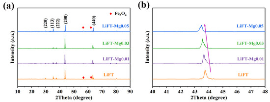In order to further analyse the microstructural morphology as well as the difference in phase species of Li2MgxFe1−xTiO4 materials under different doping levels, XRD plots were compared with each other. According to Figure 2a, it could be seen that the main phase of the sample after Mg doping was still a heterogeneous phase of Li2FeTiO4 and Fe3O4 [14,15]. Meanwhile, when the doping content reached X = 0.05, the characteristic peaks of Li2FeTiO4 gradually became shorter and wider. This might be due to the fact that excessive Mg doping amounts could lead to a decrease in the crystallinity of the sample, ultimately leading to a weakening of the characteristic peak strength [16]. In addition, impurity peaks (Fe3O4) existed in the X = 0.05 system. The possible explanation was that excessive doping of Mg2+ ions might cause lattice distortion, altering the local charge distribution. This change might prompt the redistribution of Fe2+ and Fe3+ to form a more stable Fe3O4 structure. It was worth noting that LiFT-Mg0.03 was relatively significant in both crystallinity and purity, which meant the most significant ion dynamics. Moreover, it could be seen that with the increase of doping amount, the position of the diffraction peaks shifted towards the direction of small angle corresponding to the arrow (Figure 2b). The (200) peaks exhibited a shift towards higher angles, moving from 43.7° to 43.4°. This suggested that the incorporation of Mg elements led to changes in the interlayer spacing, lattice parameters, and cell volume. This could be due to the larger ionic radius of Mg2+ [17]. The increased interlayer spacing in LiFT-Mg0.03 was anticipated to enhance the structure for lithium storage, facilitating faster ion movement and boosting kinetic behavior.