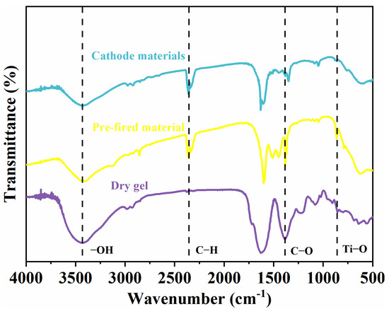 In order to investigate the structure changes of different samples, FTIR was used, as shown in Figure 3. FTIR was performed on the dry gel, pre-fired material, and cathode materials obtained from LiFT-Mg0.03. Peak regions were observed at 860 cm−1, 1000–1600 cm−1, and 3430 cm−1, corresponding to Ti−O, C−O, C−H, and −OH groups, respectively [18]. It could be found that the samples of the three stages were basically similar in terms of peak position, which indicated that the chemical bond had not changed much. However, the strength of the pre-fired samples and the cathode materials in the 1000–1600 cm−1 region was weakened because of the decomposition of esters caused by high-temperature calcination.