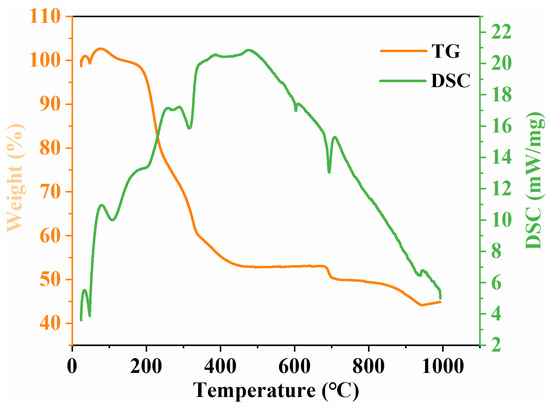In order to study the thermal stability of the dry gel of LiFT-Mg0.03 material and its crystallisation process, we decided to carry out TG-DSC analysis (Figure 4). From the figure it can be seen that the whole heating process can be divided into four stages: (1) 25–200 °C; (2) 200–460 °C; (3) 460–680 °C; and (4) 680–1000 °C. In the first stage, about 1.4% of the mass was lost, corresponding to the DSC curve with two absorbing peaks and two exothermic peaks, of which the more obvious absorbing peak at 100 °C corresponded to the loss of water of crystallisation of the compounds; in the second stage, more mass was lost, about 45%, corresponding to the DSC curve with one exothermic peak and two absorbing peaks. One of the absorbing peaks indicated that the thermal decomposition of citric acid occurs to trigger a large amount of weight loss. And the other absorbing peak indicated that the metal salts (e.g., FeCl2, Ti(OC4H9)4, CH3COOLi) had begun to decompose thermally. In the third stage, there was no obvious loss of mass, and the corresponding DSC curve had no obvious heat-absorbing and exothermic peaks. This might be the initial generation of LiFT-Mg0.03 crystals. There was an 8% loss of mass in the fourth stage, and the corresponding DSC curve was relatively flat with no obvious heat-absorbing and exothermic peaks. This stage was the further generation of LiFT-Mg0.03 crystals.