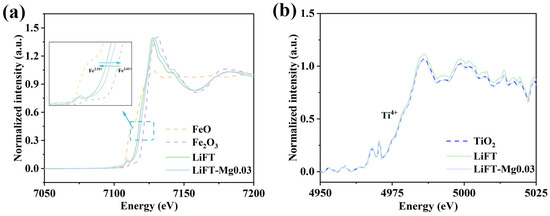 For further analysis of the elemental valence states of LiFT and the LiFT-Mg0.03 samples, XAS was organized. Standard Fe2O3 and FeO reference spectra were used to compare with the K-edge of Fe. Both LiFT and the LiFT-Mg0.03 samples displayed signs of Fe existing in a mixed valence state, with valence states of +2.53 for LiFT and +2.61 for LiFT-Mg0.03 (Figure 5a). This phenomenon indicated that the introduction of Mg2+ slightly increased the valence state of the Fe layer, which was conducive to the enhancement of the Fe-O effect and facilitated the rapid migration of lithium ions [19,20,21,22,23]. Additionally, the Ti K-edge XANES spectra revealed that Li2FeTiO4 exhibited no notable changes, suggesting that the Ti valence remained consistently at +4 (Figure 5b).