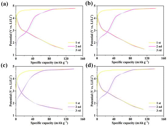 A series of experiments were carried out to examine how Mg doping influences the electrochemical performance of LiFT, including LiFT-Mg0.01, LiFT-Mg0.03, and LiFT-Mg0.05. The initial capacities were measured at 114.5, 113.6, 112.1, and 111.4 mAh g−1, respectively (Figure 6a–d). Because magnesium is chemically inert, its capacity tends to decay as the magnesium content increases. In addition, the repeatability of the charge curves of doped cathode materials was better than that of undoped materials. As a result, Mg doping helped improve structural stability and promoted the fast transport of lithium ions.