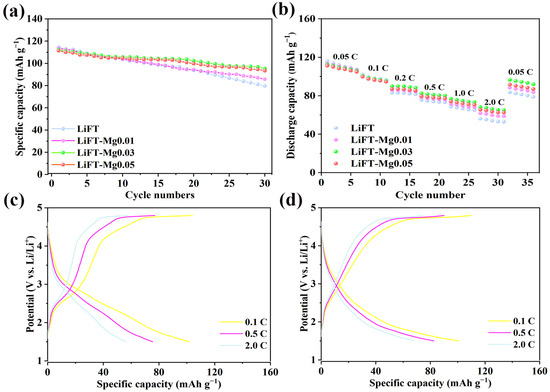 In addition, the samples underwent further testing to evaluate their cycling performance at 0.05 C. At the 30th cycle, the capacities of LiFT, LiFT-Mg0.01, LiFT-Mg0.03, and LiFT-Mg0.05 were measured at 79.7, 85.8, 95.3 and 93.4 mAh g−1, representing 69.6%, 75.5%, 85.0% and 83.8% of their initial capacities, respectively (Figure 7a). The LiFT-Mg0.03 cathode material showed the greatest stability across the charge/discharge cycles. Finally, rate performance was evaluated across various current densities (0.05–2.0 C) (Figure 7b). It was observed that as the current density increased, the capacity of all the samples declined. At 2.0 C, the capacities were 56.1, 61.7, 68.1 and 65.4 mAh g−1, which accounted for 48.4%, 54.4%, 60.6% and 58.1% of their initial values, respectively. After cycling the samples back to 0.05 C, the reversible capacities were recorded at 83.5, 88.4, 96.5 and 91.6 mAh g−1, representing 72.0%, 78.0%, 85.9% and 82.4% of the original capacities. Clearly, the LiFT-Mg0.03 cathode material demonstrated the best rate performance, which could be attributed to its wider layer spacing and improved ion transmission characteristics. This finding was further confirmed by XRD and EIS. Moreover, compared with LiFT, LiFT-Mg0.03 had better charge–discharge characteristics at different current densities (Figure 7c,d). The coulomb efficiency of the two samples was greatly improved compared with Figure 6. Because of the pre-activation, the growth of the CEI film was conducive to a more stable charge and discharge.
