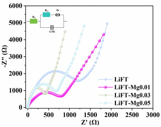 In order to investigate the relationship between impedance and Mg doping, the EIS of different doped materials were compared, as shown in Figure 8. The main features of the curves were a semicircle and a straight line [24,25]. The high-frequency semicircle was said to be closely related to charge transfer resistance (Rct) and ion migration dynamics [26]. With the increase in doping amount, the impedance of electrode material decreased first and then increased further. The Rct values for LiFT, LiFT-Mg0.01, LiFT-Mg0.03, and LiFT-Mg0.05 were recorded at 1200.8 Ω, 802.5 Ω, 408.8 Ω and 671.9 Ω (Table 1). These results convincingly expounded that Mg doping upgraded the sodium ion movement, and further supported the optimization design of LiFT-Mg0.03.