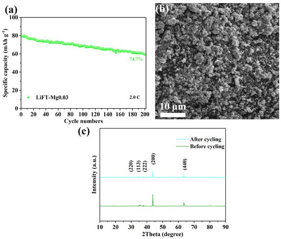 In order to better evaluate the effect of a high current environment on LiFT-Mg0.03, we conducted a high current cycle test again. After the study, it was found that LiFT-Mg0.03 still retained 74.4% of the initial value after 200 cycles at 2.0 C (Figure 9a). Then, the morphology and structure of the recycled materials were tested again. After a long cycle, LiFT-Mg0.03 could still maintain its original morphology and crystal structure while the crystallinity decreased after cycling, possibly due to lattice damage caused by long-term charge and discharge (Figure 9b,c). In general, the sample still had the potential for long-term operation with a certain high current.