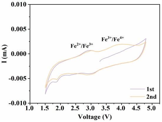 In order to study the basic history and thermodynamic characteristics of the electrochemical reaction of LiFT-Mg0.03, CV curves were performed at 1.5–4.8 V. It could be noticed that there were still three sets of oxidation peaks and three sets of reduction peaks in Figure 10. And the locations of the peaks in both cycles were strikingly similar, suggesting its favourable electrochemical reversibility. A notable peak appeared in the potential range around 3.0 V, corresponding to the oxidation of Fe2+ to Fe3+, a typical reaction observed during cycling [27]. As the voltage increased to 3.8 V, Fe3+ was further oxidized to Fe4+ [28,29]. These indicated that the battery could store energy reliably while maintaining stability and a long lifespan.