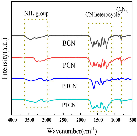 Figure 1 shows the XRD patterns of samples BCN, BTCN, PCN, and PTCN. It can be observed from the figure that BCN, BTCN, PCN, and PTCN samples all have prominent diffraction peaks at 13.3° and 27.5°, among which the peak at 27.5° is the (002) peak of g-C3N4, representing the aromatic triazine ring’s interlayer accumulation structure, and the interlayer distance is d = 0.326 nm. The (100) peak of g-C3N4 is represented by the peak of 13.1, which is in line with the crystal structure of g-C3N4 and shows the in-plane structure of the triazine unit with an in-plane distance of d = 0.676 nm. This indicates that the sample can retain g-C3N4’s graphene-like in-plane and interlayer properties. In addition to the displacement of diffraction peaks, it is also noted that with the increase in TCNE content, the peak strength of PTCN and BTCN samples decreases, and the half-peak width becomes more extensive than that of PCN and BCN samples. Such changes reflect the deterioration of crystal quality and reduction in size, indicating that TCNE copolymerization with melamine can cause defects in the g-C3N4 generated. The quality and size of graphite-like structures worsen and decrease in size.
