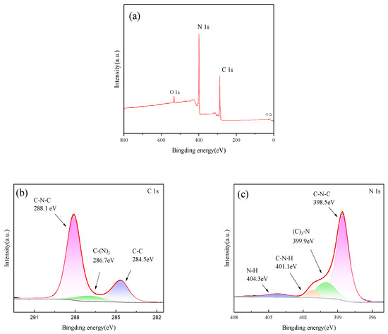 Figure 6 shows the XPS diagram of sample PTCN. It can be seen from Figure 6a that sharp photoelectron peaks appear at the binding energies of 287 eV and 399 eV, which are attributed to C1s and N1s, respectively, indicating that the sample is mainly composed of carbon and nitrogen. Figure 6b shows that for C1s, three peaks of 284.5, 286.7, and 288.1 eV can be fitted. The first peak refers to the characteristic peak of the presence of C atoms in the sample, the second peak is attributed to the C–(N)3 bond, and the third peak is the typical signal of sp2 hybrid carbon, which can be identified as the C-N=C bond in g-C3N4. Figure 6c shows that the N1s spectrum can be simulated to synthesize four peaks, among which the peaks centered at 398.5 eV and 399.9 eV correspond to sp2 hybrid nitrogen (C-N=C) and N–(C)3 in the triazine ring, respectively, while amino functional groups generate the weak peaks at 401.1 and 404.3 eV. This may be due to incomplete condensation of the amino group.