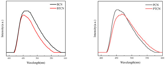 A photoluminescence (PL) emission spectroscopy was used to investigate the transfer and recombination of photogenerated carriers in semiconductor materials. Figure 7 shows the PL spectrum of each sample. The images in Figure 7 show that in the visible light band (about 420 to 550 nm), all samples can produce fluorescence signals, indicating that the material can generate electron-hole pairs when absorbing photons, which is a critical step in triggering a photocatalytic reaction. With the addition of TCNE copolymerization, PL signal intensity decreases, indicating that the photogenerated carrier recombination rate decreases. TCNE copolymerization can inhibit the photogenerated electron-hole carrier recombination and improve its separation efficiency. The increase in charge separation efficiency can be attributed to the increase in sample pore volume and surface area, which is favorable for the transfer and separation of photogenic charge carriers, extending their lifetime and thus reducing PL strength.