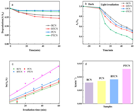 Photocatalytic performance of BCN, BTCN, PCN, and PTCN: (a) Degradation Effect Over Time. (b) Photocatalytic Degradation Rates of Different Samples. (c) Assessment of Reaction Kinetics. (d) Reaction Rate Constants.