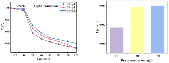 Figure 9 shows the photocatalytic effect of degradation of different concentrations of drugs (10 mg/L, 20 mg/L, 30 mg/L) using PTCN samples. It can be seen from the figure that the catalytic degradation effect is related to the tetracycline concentration. When the tetracycline concentration is 20 mg/L, the catalytic effect is the best; when the tetracycline concentration is 30 mg/L, the catalytic effect is the worst. The reasons for this change are as follows: for PTCN samples, the photogenerated electron holes are unchanged at the same time under the condition of illumination; that is, the generated active substances are constant. When the concentration of tetracycline increases, the active substance that can catalyze the degradation of tetracycline does not increase, and too many tetracycline molecules will block the absorption of light by the catalyst, which will inevitably lead to a poor degradation effect.